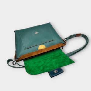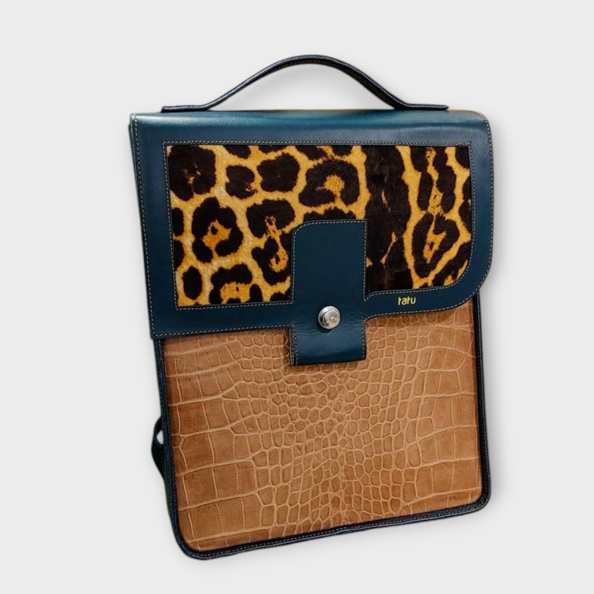 szín: petrolkék, leopárd mintás festett szőr, konyak színű krokodil nyomatos marhabőr,