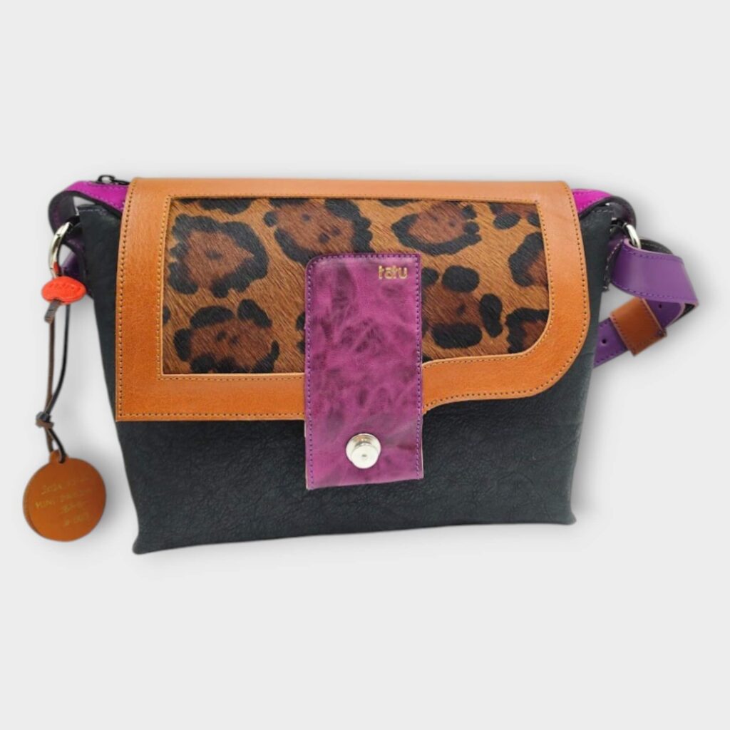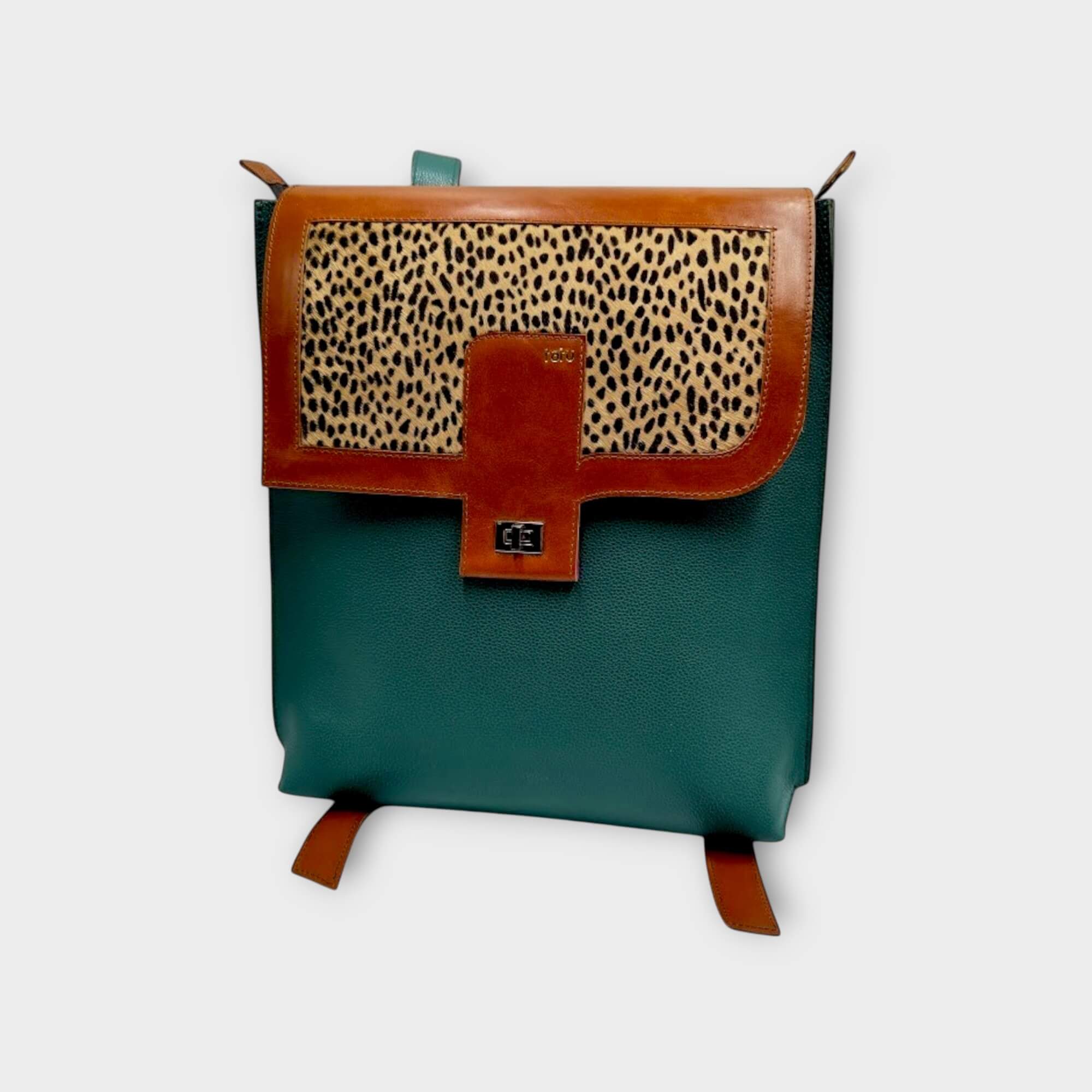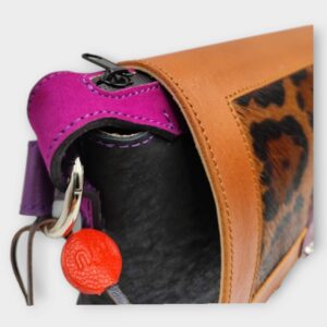 Bőven pakolható, belsejében 1 db 23×20 cm belsőzseb, külsején a hátrészen 1 db nagy lapos zseb a táska teljes szélességében. Záródása cipzárral és egy fém táskazárral. Vállpántja állítható övcsatos. Hátizsák fedlapja festett szőrrel díszített, merevített jó tartással.