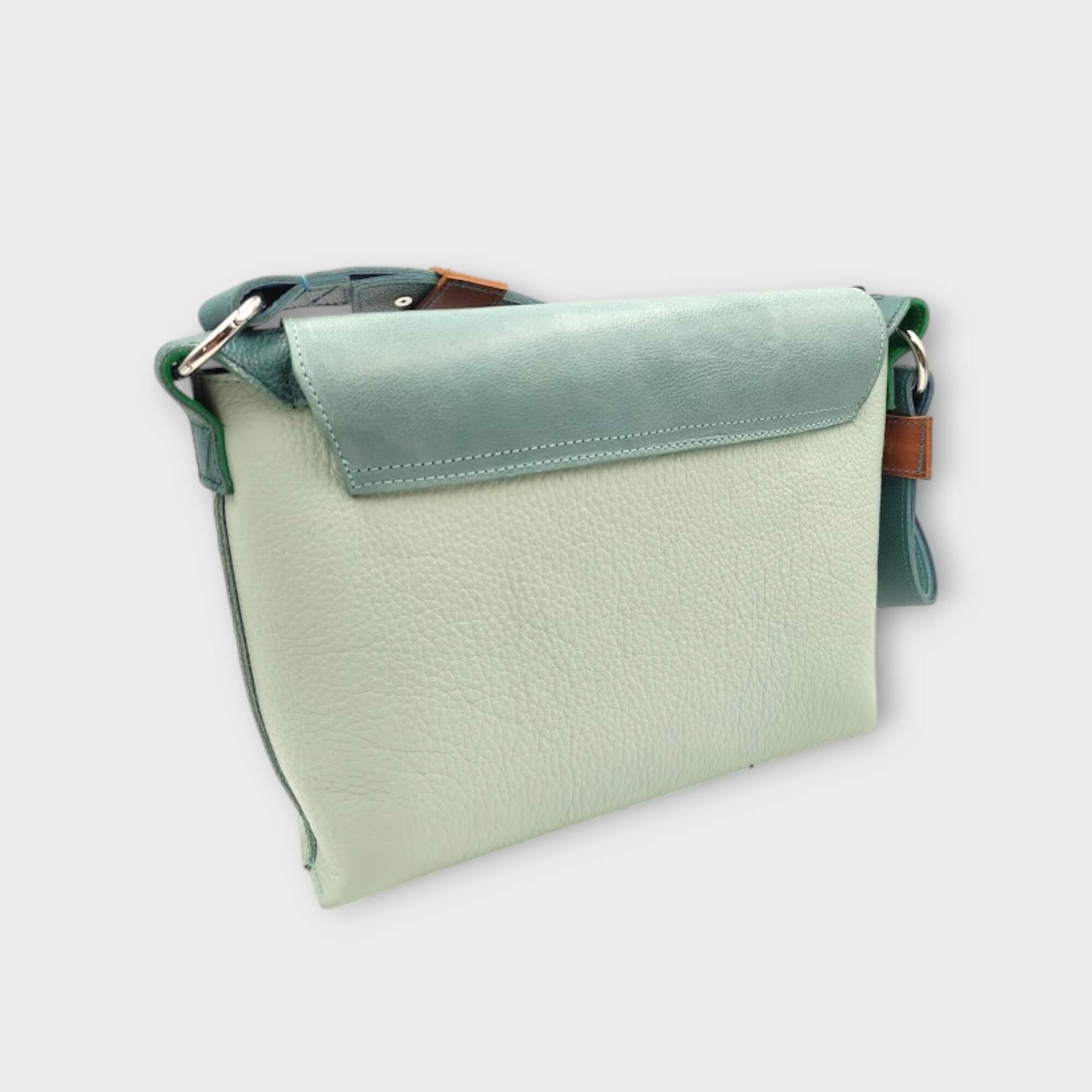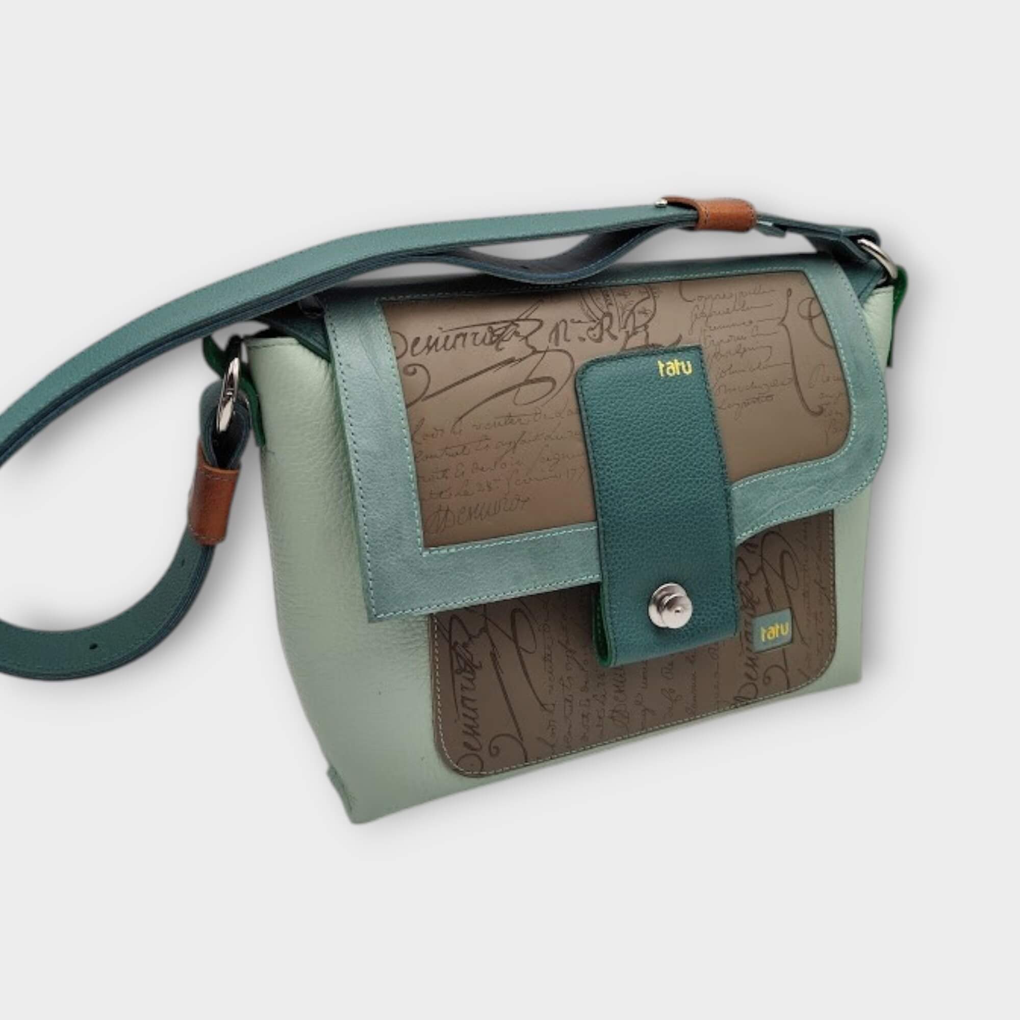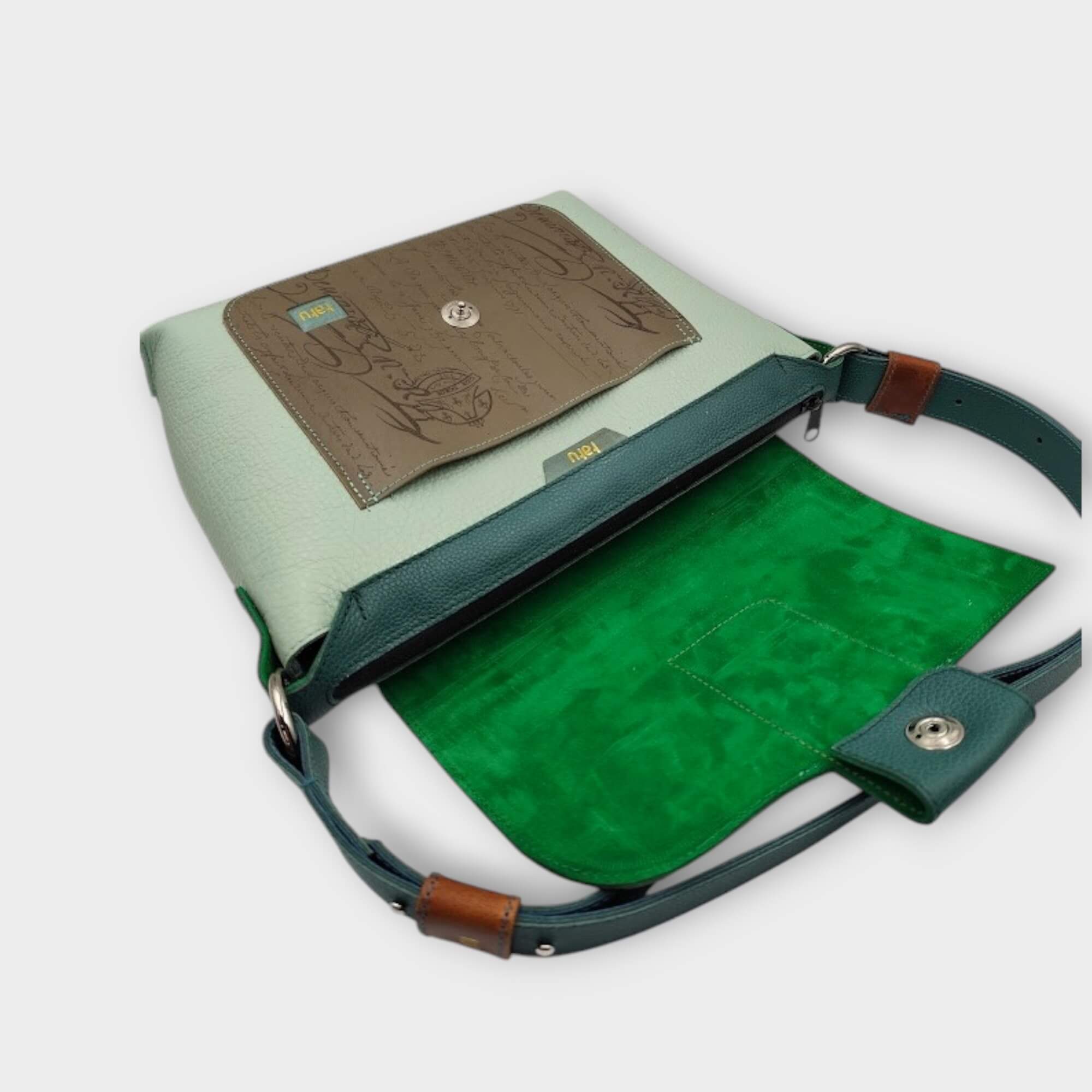 szín: menta, türkiz, szürke marhabőr kalligráfikus marással, petrolzöld