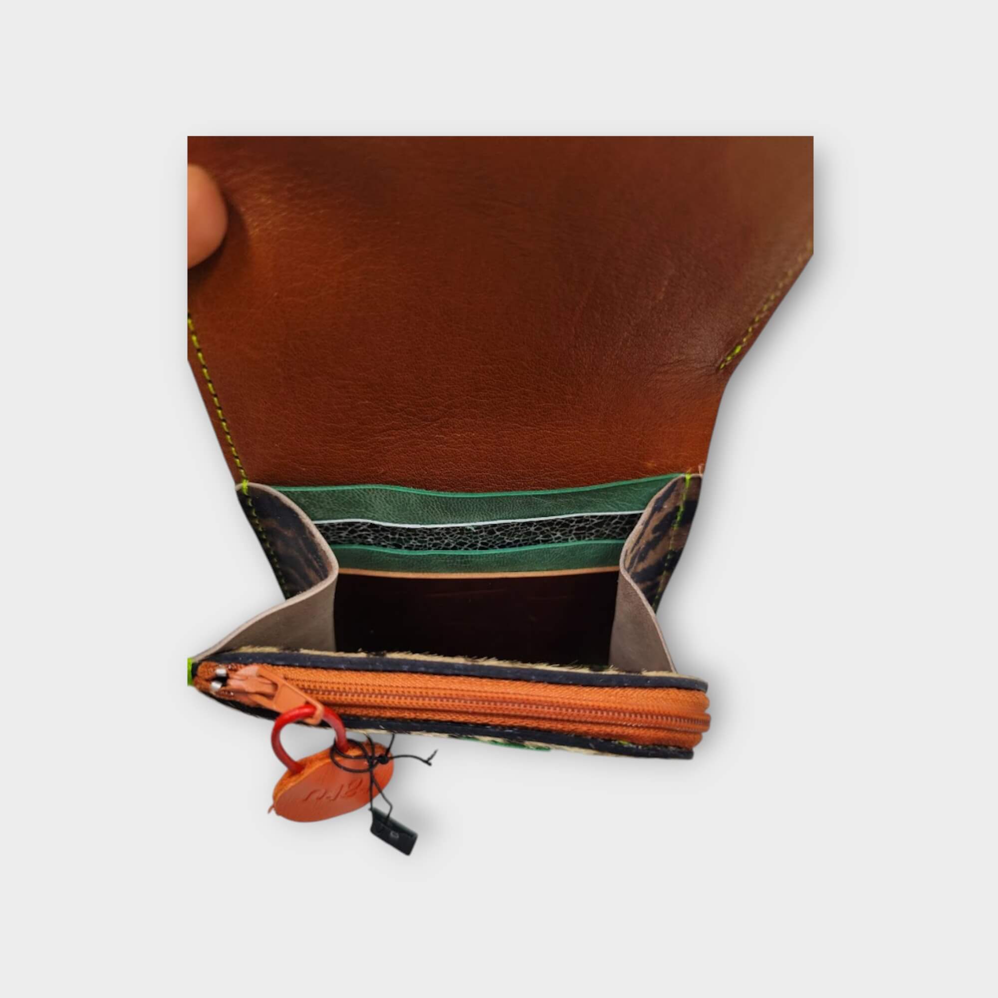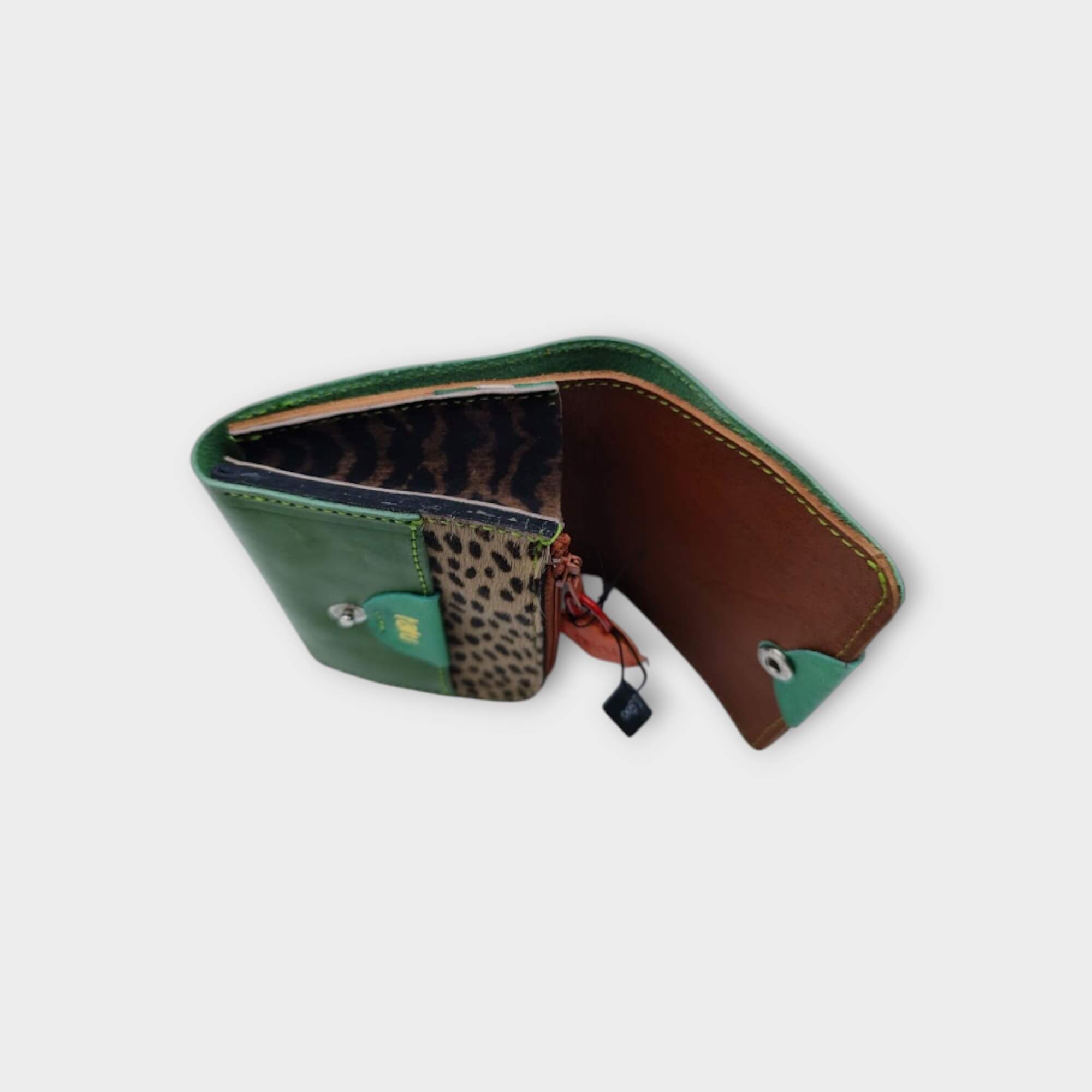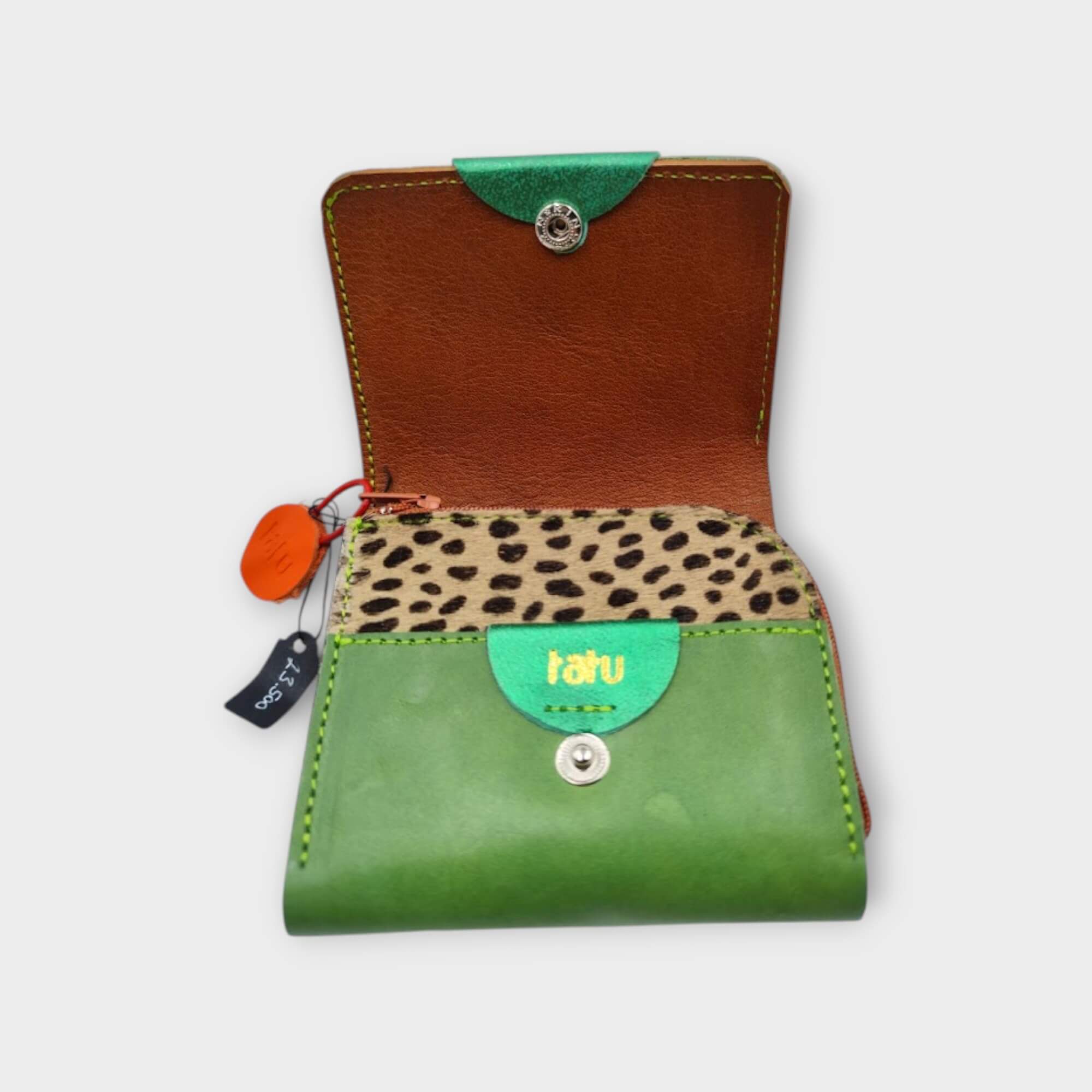 barna marhabőr, zöld festett szőr, metálzöld kecskebőr és egy kis pettyes szőr