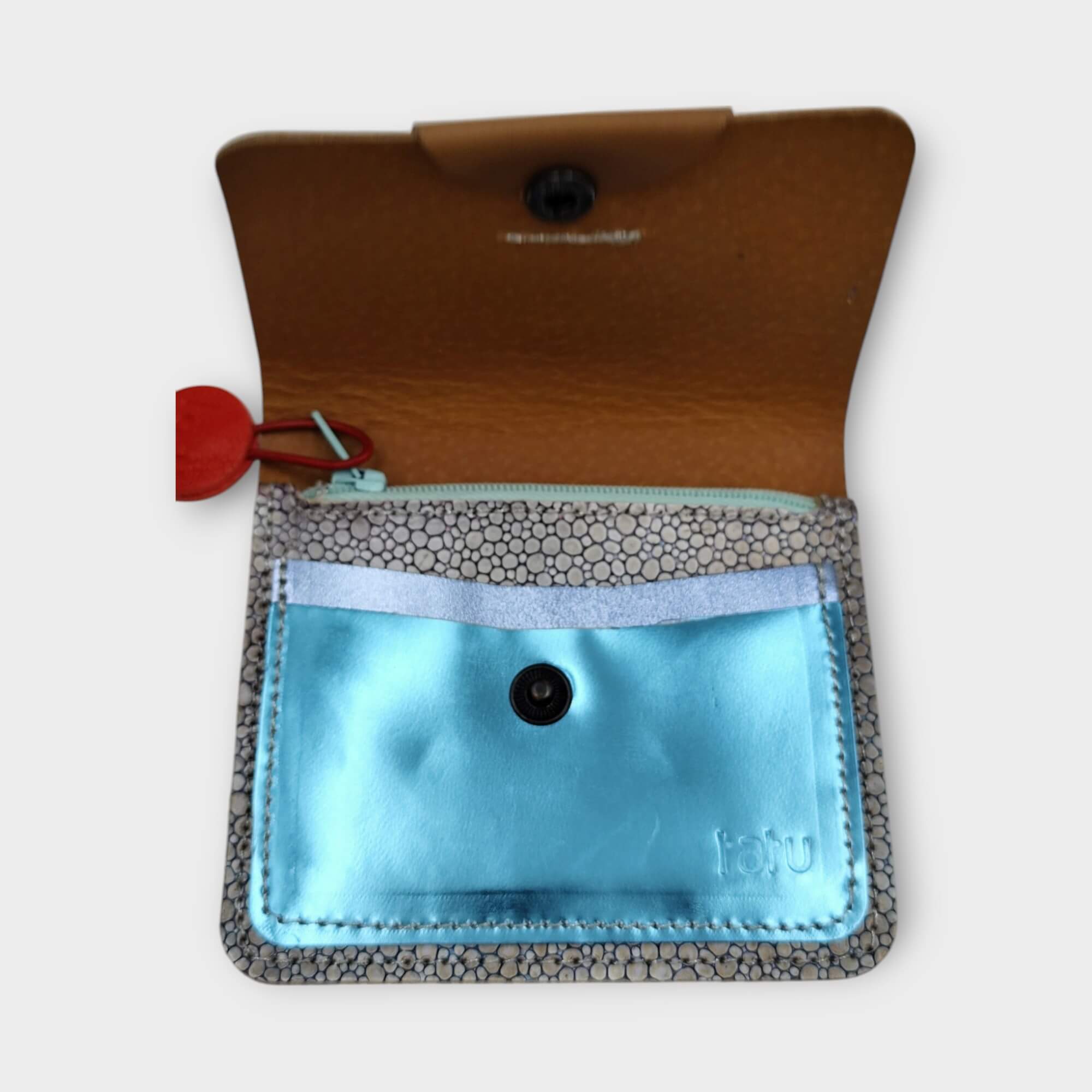 Tárca tervezése célja a kártyatartó funkció volt, de helyet kapott benne egy kis cipzáros zseb aprópénznek, és a mögötte lévő  rekeszben félbehajtott papírpénz is helyet talál. Elején és a hátulján is 2-2 kártyatartó zseb található.