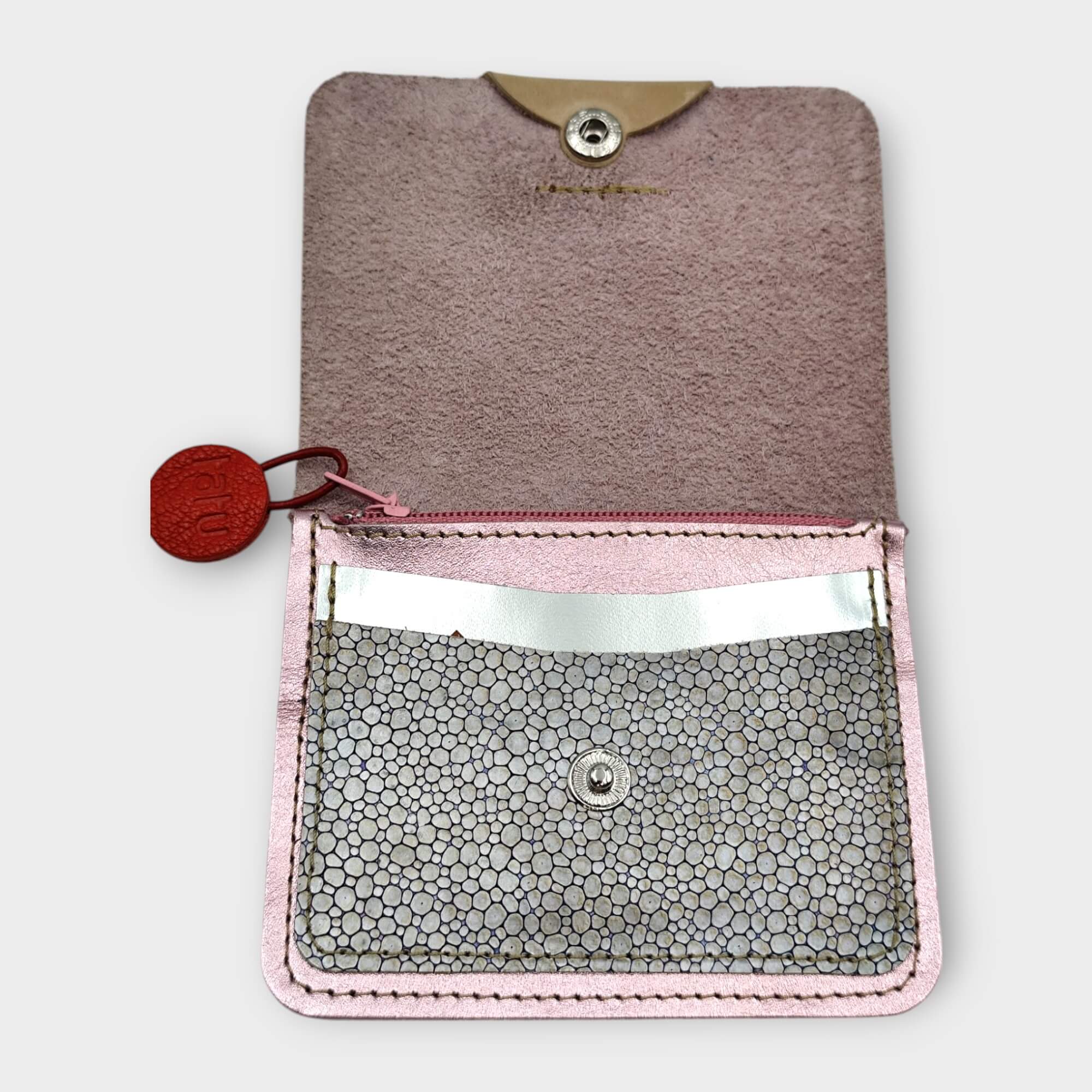 Tárca tervezése célja a kártyatartó funkció volt, de helyet kapott benne egy kis cipzáros zseb aprópénznek, és a mögötte lévő rekeszben félbehajtott papírpénz is helyet talál. Elején és a hátulján is 2-2 kártyatartó zseb található.