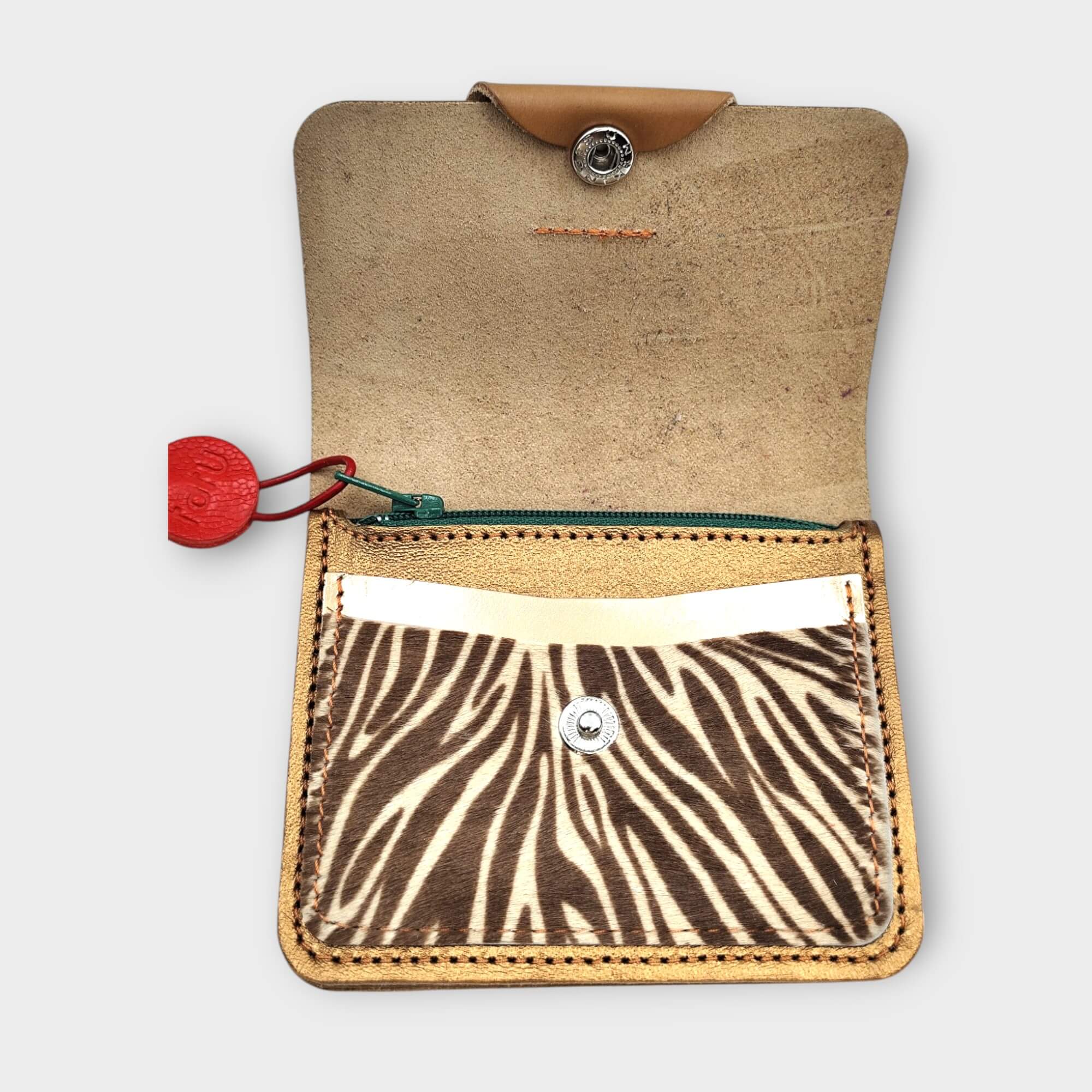 színek: camel barna, óarany kecskebőr, festett zebra mintás szőr