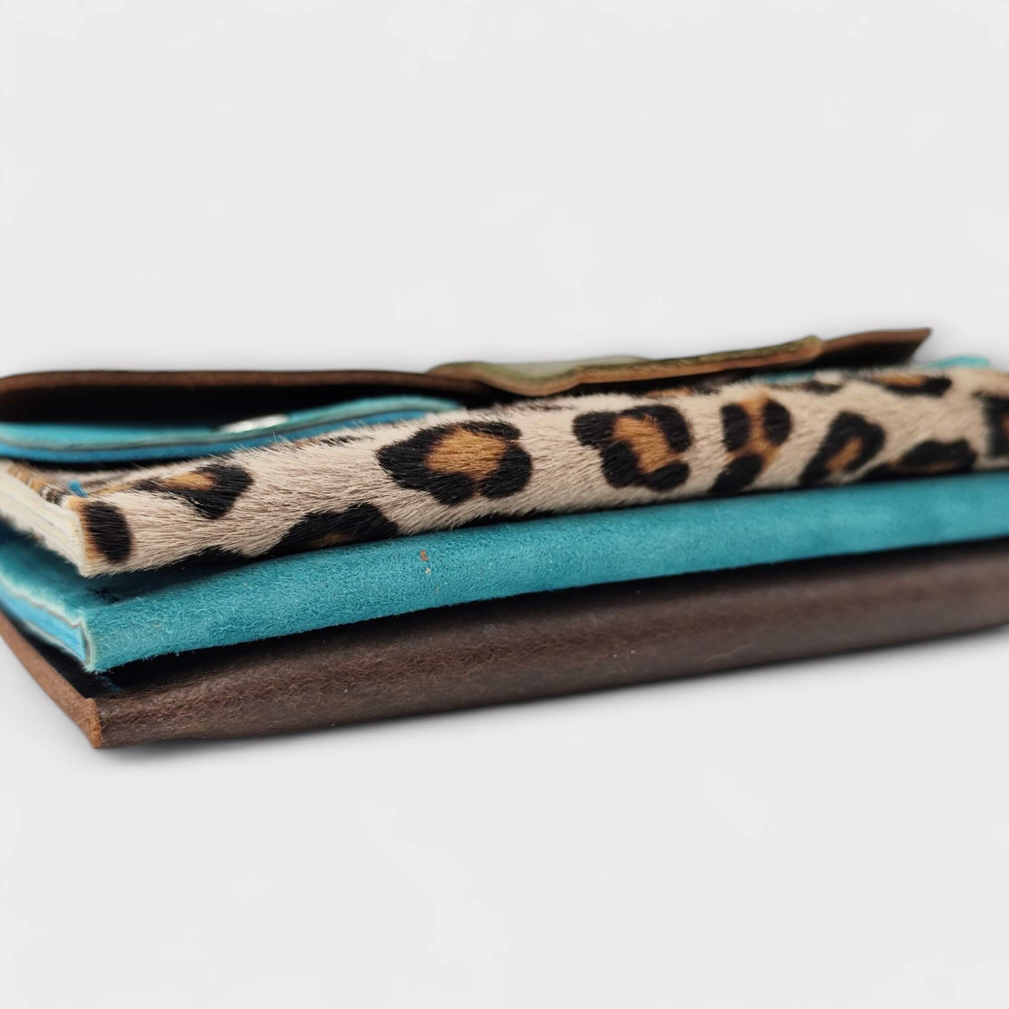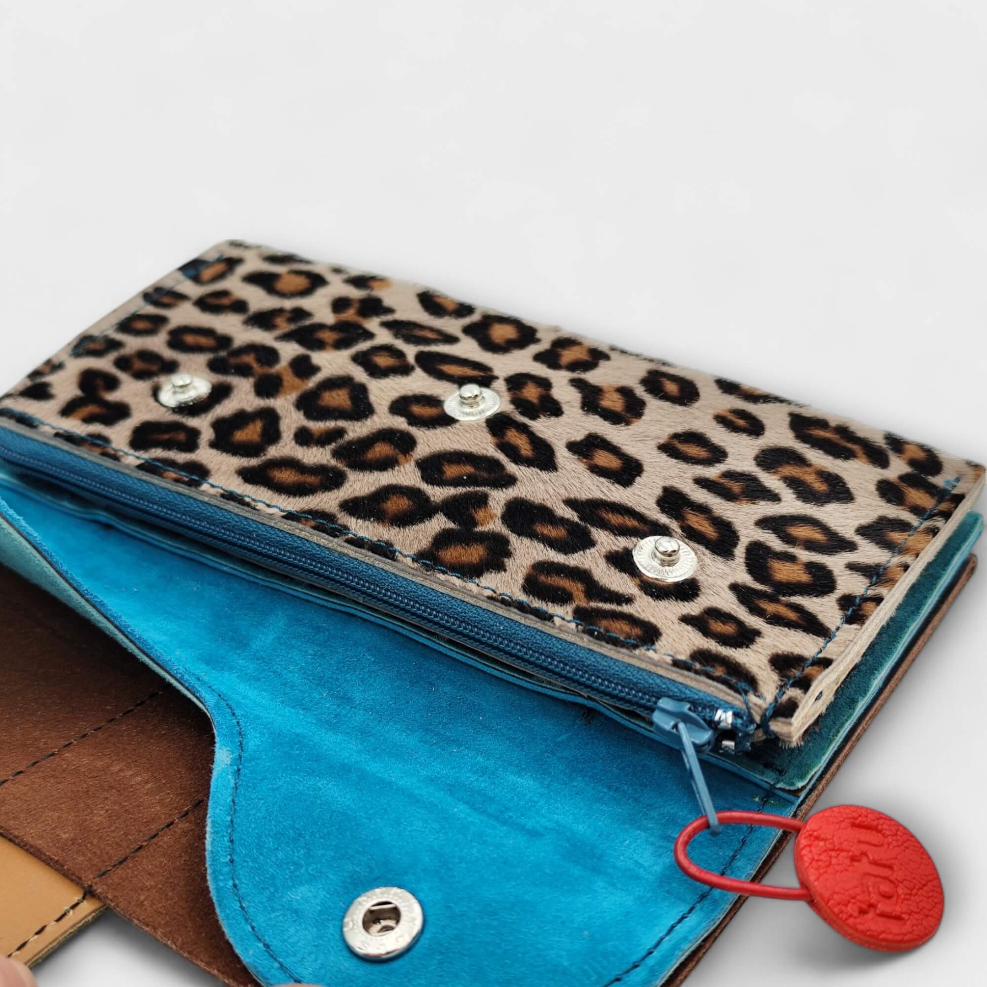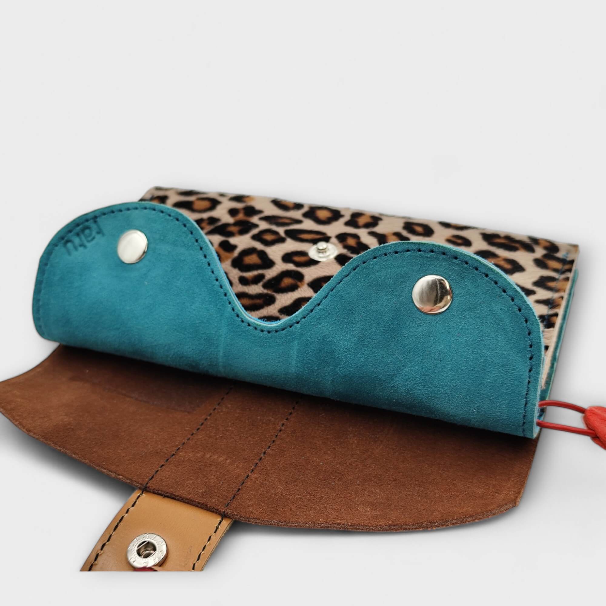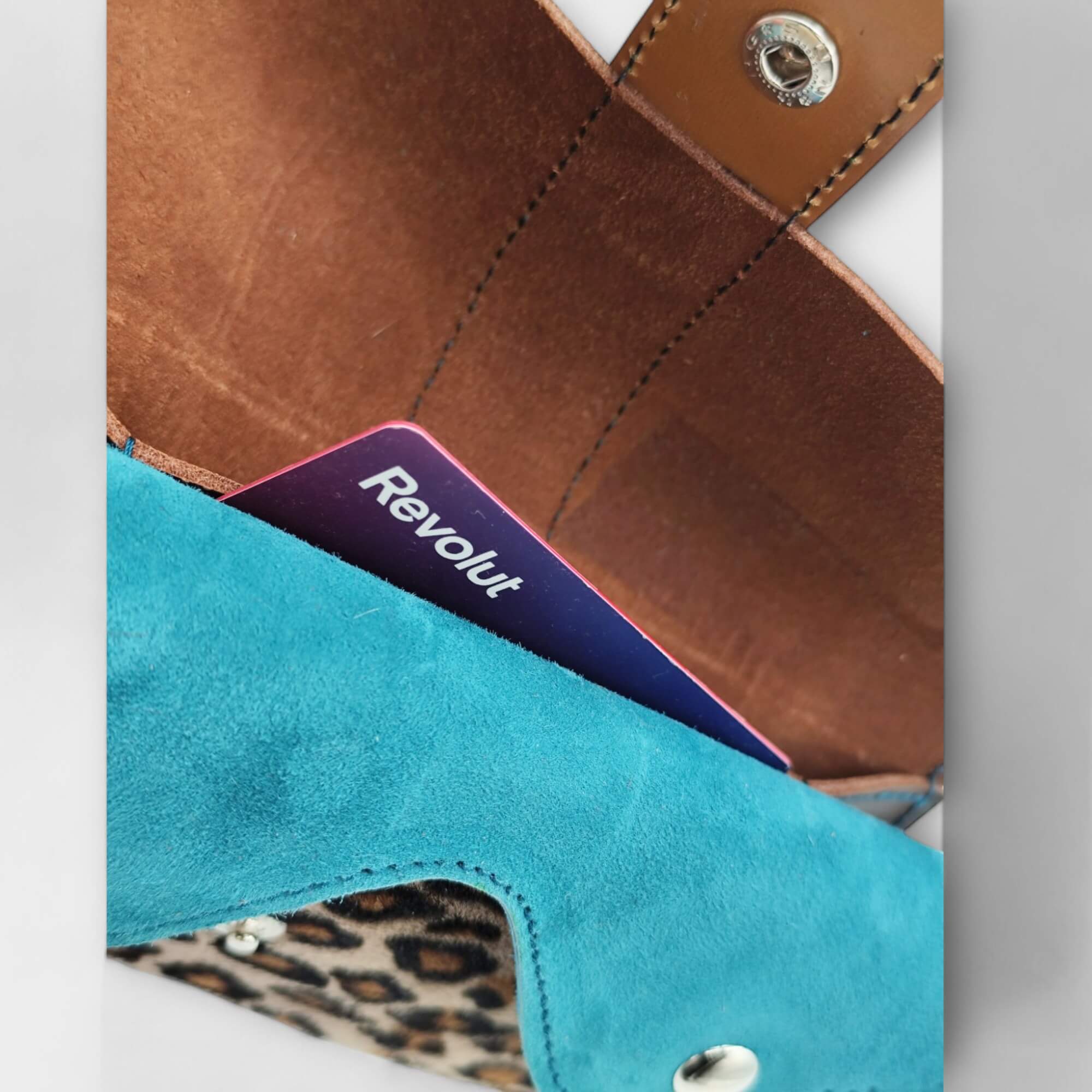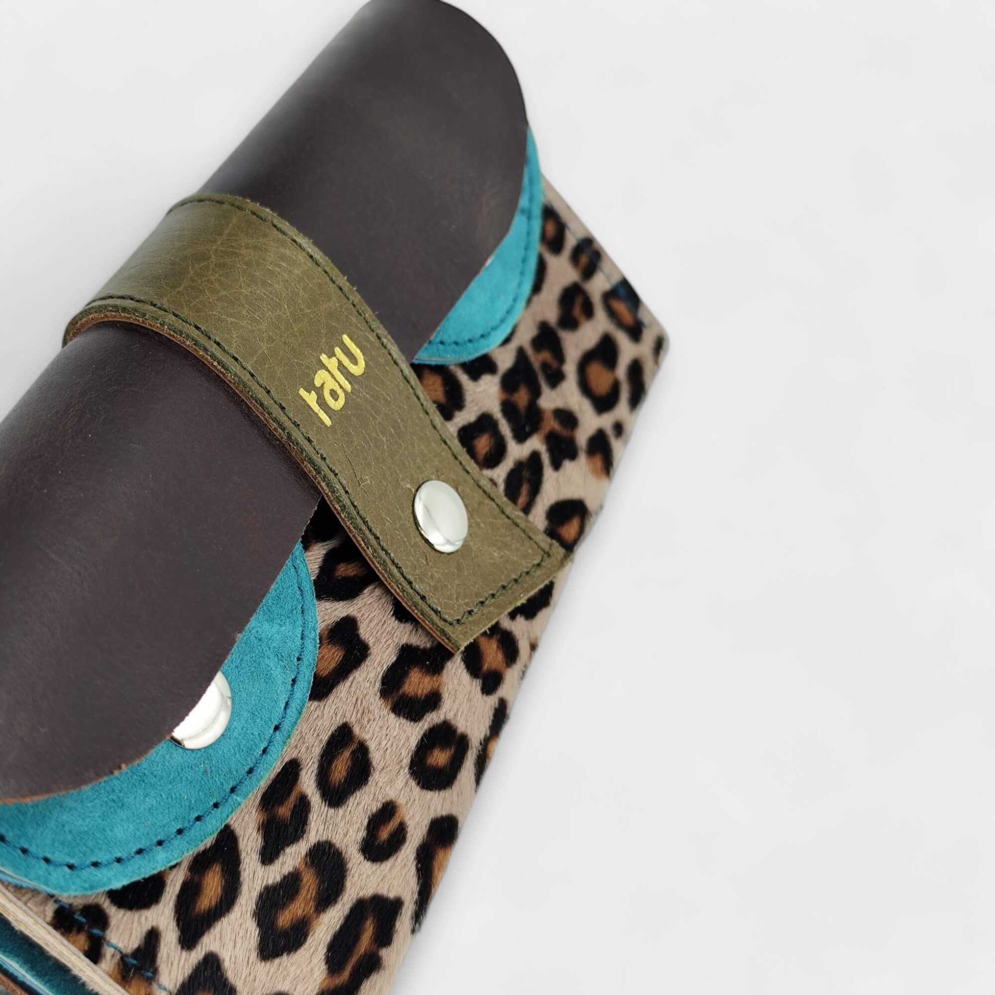 Szín: kakaóbarna matt bőr, türkizkék velúr, festett leopárd mintás szőr