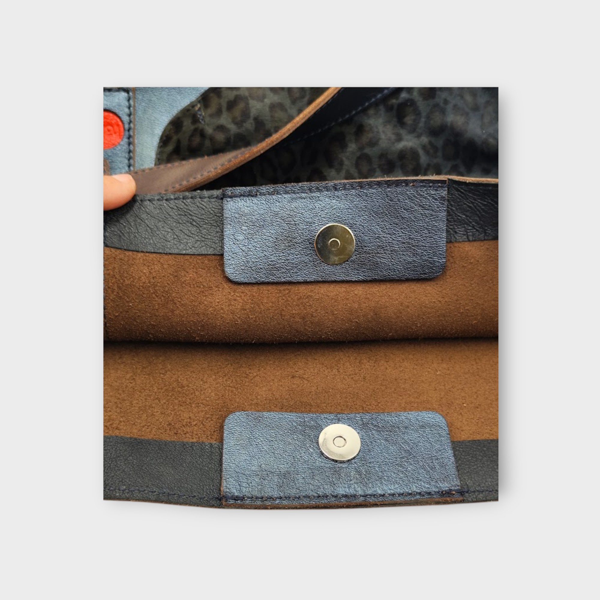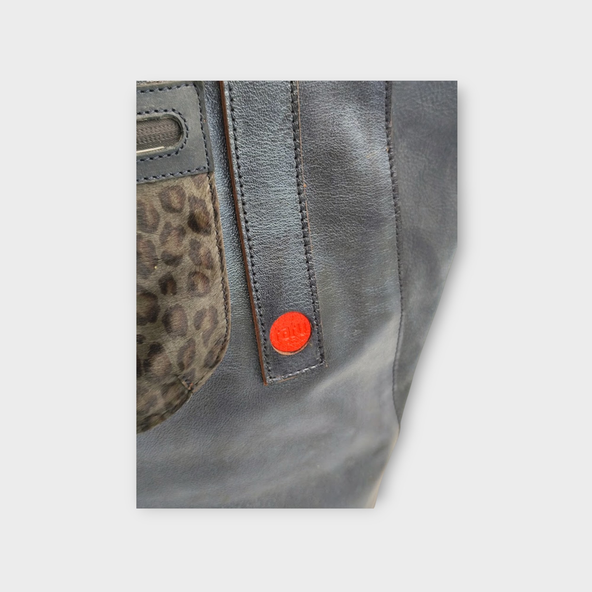 Szín: grafit, kékes fényű marhabőr, festett leopárd mintás szőr éjjkék