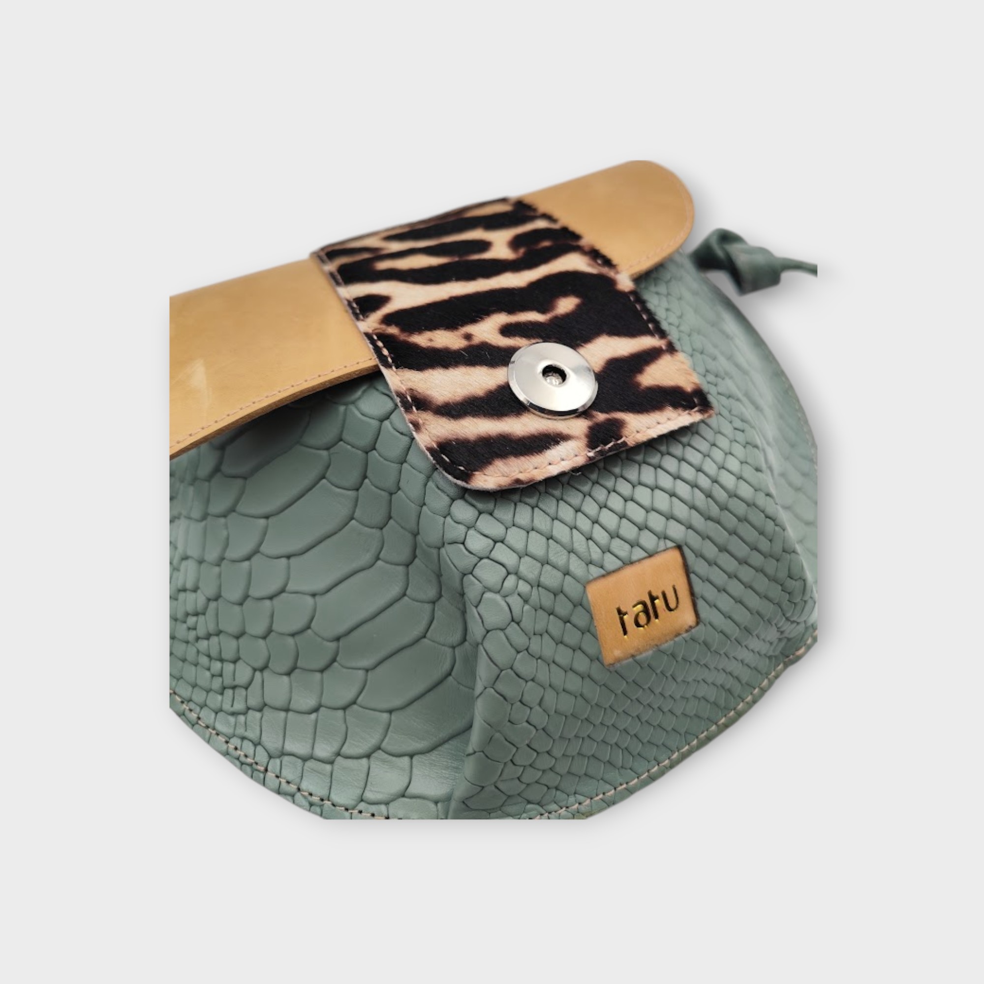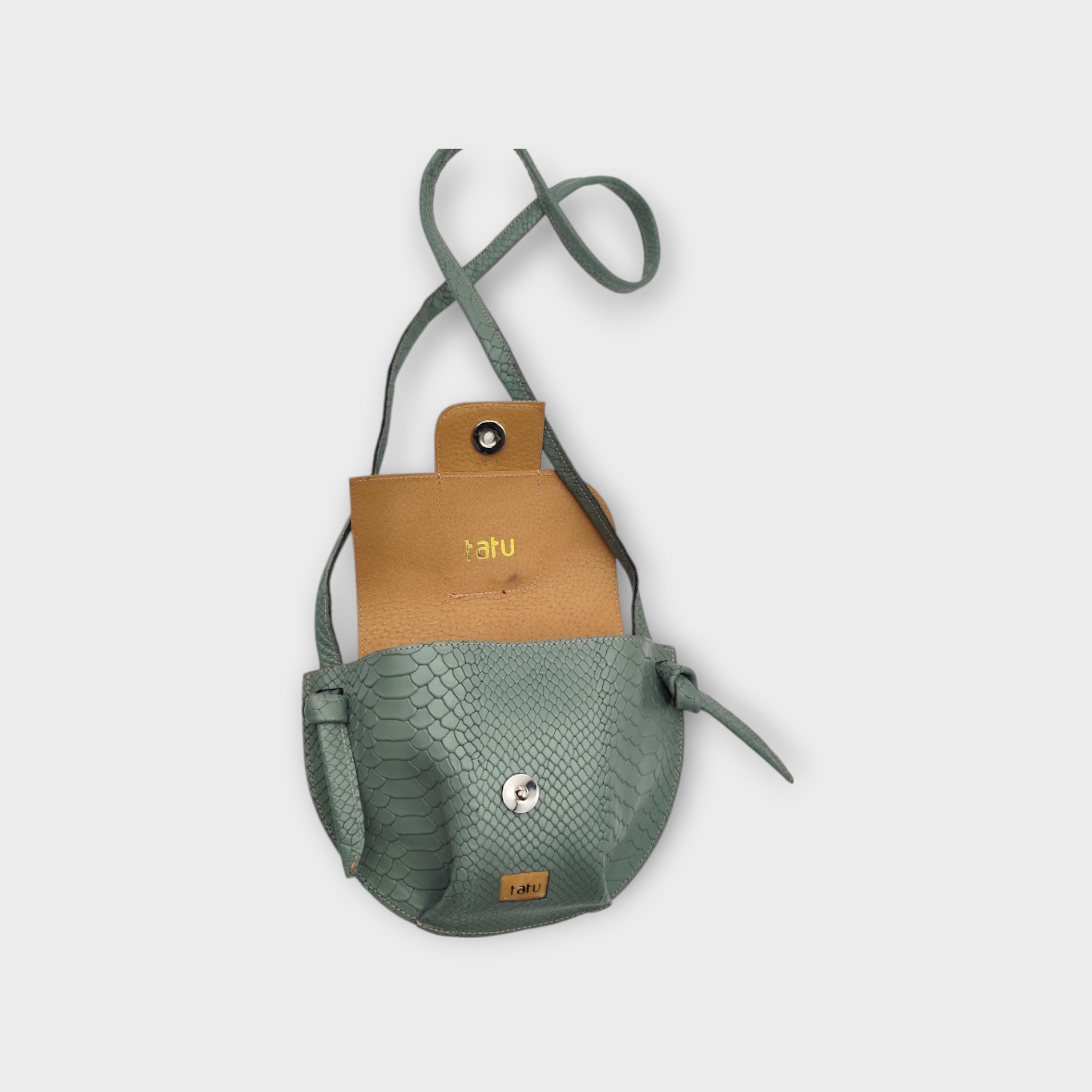 A kistáska tervezésénél a praktikusságot vettem figyelembe, a fedlap szabásának játékával helyet kapott egy belső zseb, mely tökéletesen kompatibilis a tatu MINI pénztárcával, a fő rekeszben kényelmesen elfér telefon kulcs és még pár apróság.