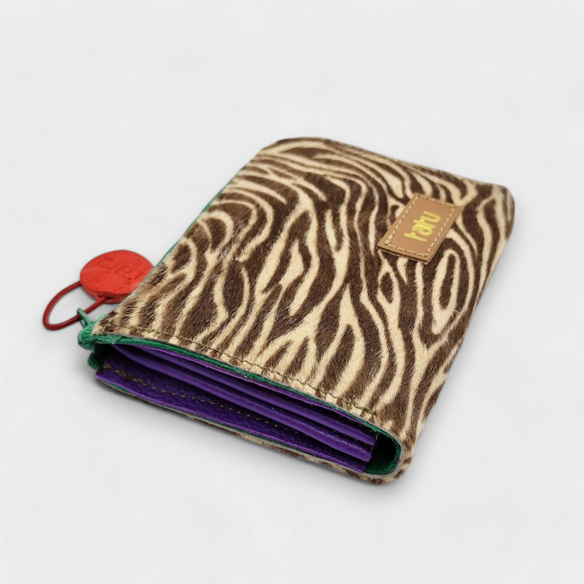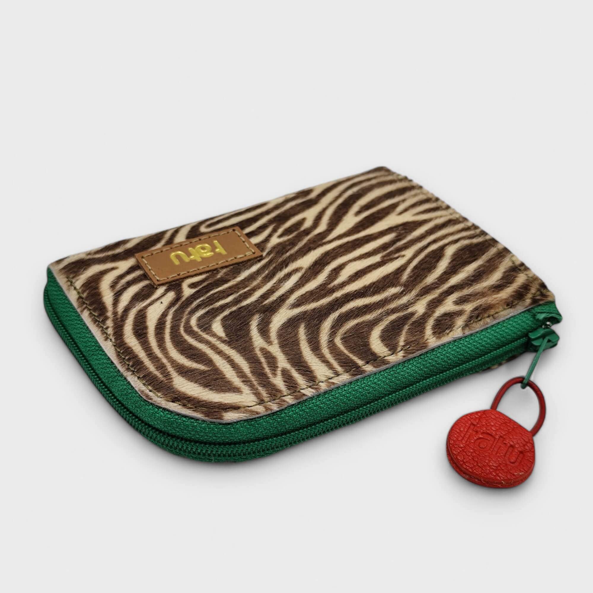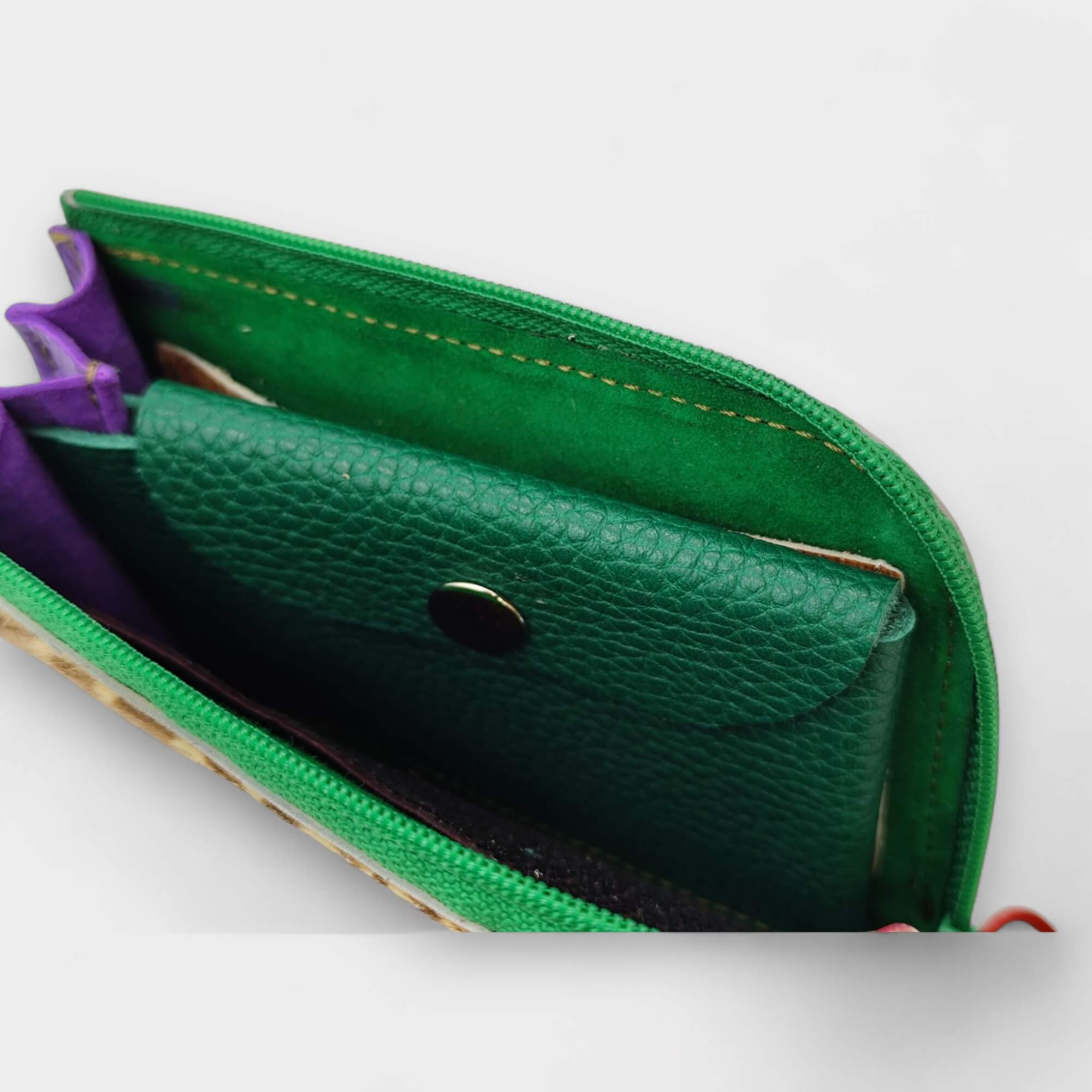 anyag-szín: világosbarna zebra színú festett szőr, töld velúr bélésbőr, zöld aprótartó, zöld cipzár